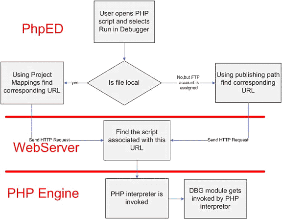 While remote projects are rather straightforward, remote debugging will take a bit of setting up on the IDE to ensure that it works correctly. To give you a quick understanding of the process, below you can see a image from the PHPEd forums which highlights well what happens during a remote debugging session.